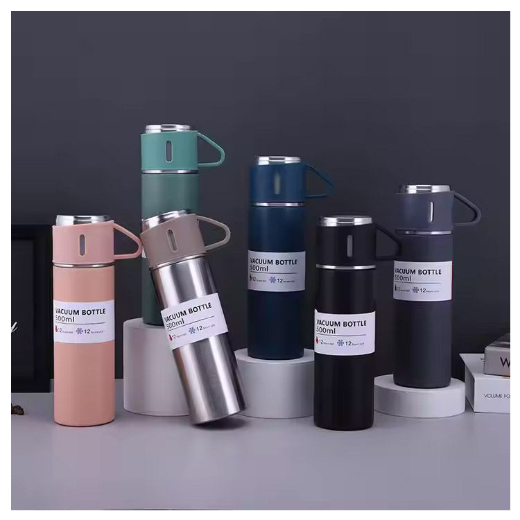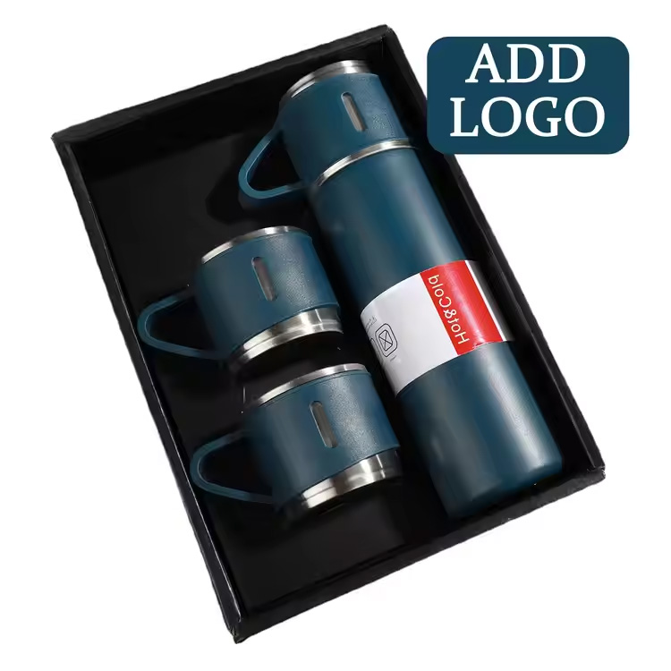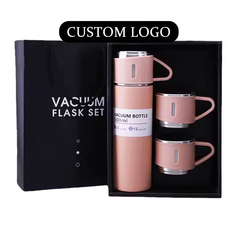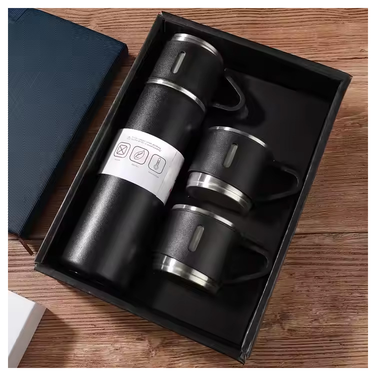 Kalebu Flaskum Flaskum 500ml lan Loro Piala Insulated, kabeh dikempalken kanthi apik ing kothak hadiah sing apik kanggo nggawe liburan, hadiah koreksi, utawa promosi klien.