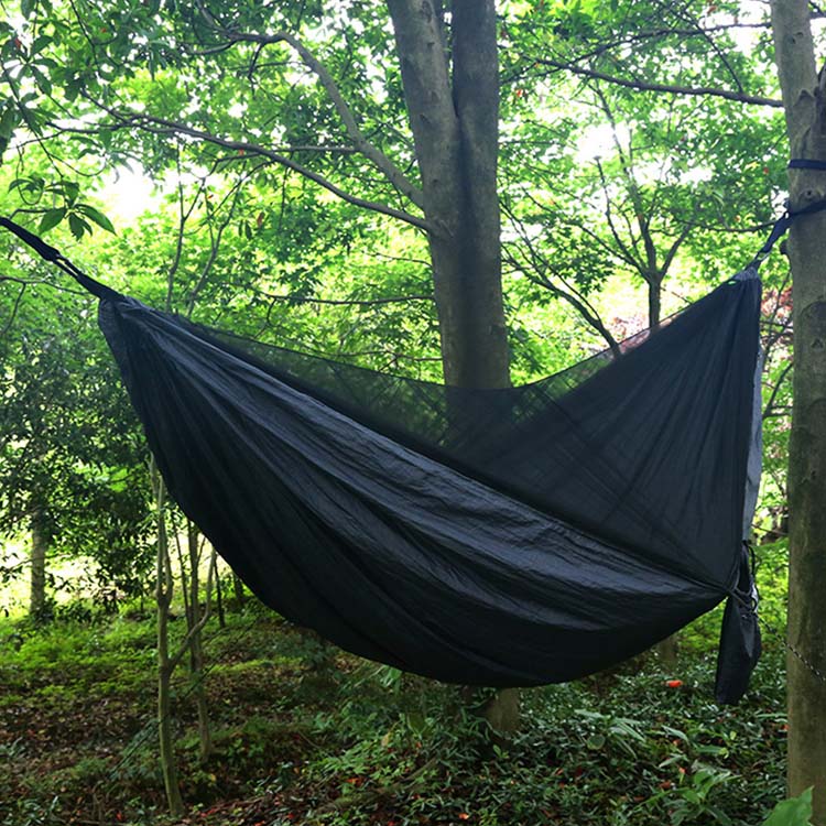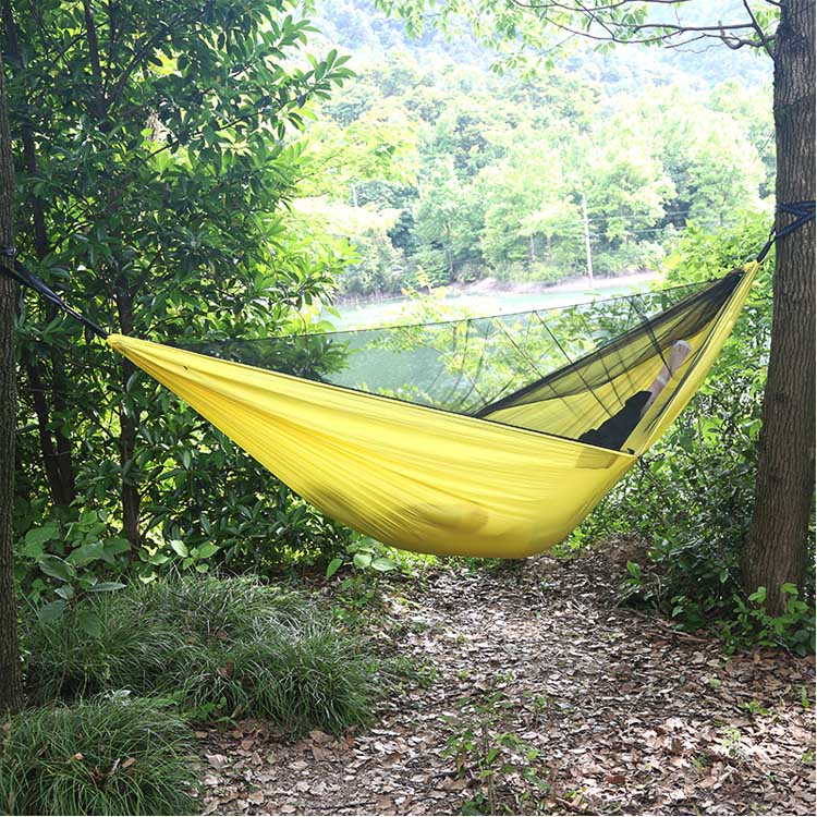 Fitur net 210T polyquito net kanthi sudhut sing dikuatake lan awak Nylon Hammock 70d, nggawe keseimbangan sing sampurna ing antarane perlindungan serangga sing bisa ngilangi lan kapasitas bobot sing awet.